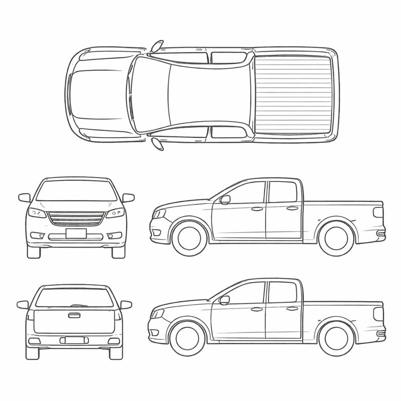 - Sedan, SUV, van, pickup, hatchback, coupe, convertible, passenger van, box truck, golf cart, motorcycle, bicycle, and tractor/other layouts.